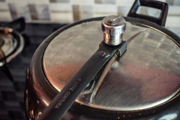 For bone-in mutton pieces (which is what most Indian recipes use), you need around 10 whistles on medium heat. If you’re using boneless mutton, 7 to 8 whistles will do. The key is to always cook on medium flame — not high. High heat whistles are faster but the meat won’t cook through properly, and you’ll end up with tough, chewy pieces.